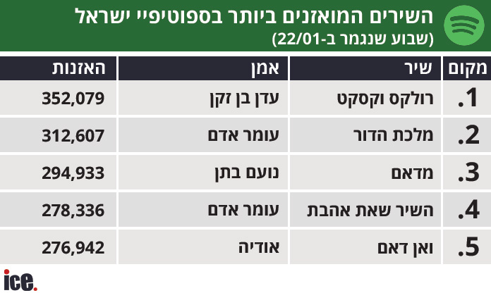 דירוג ספוטיפיי: גם השבוע עומר אדם מוביל את רשימת האמנים המושמעים ביותר באפליקציה האהובה, במקום השני והשלישי נמצאים פאר טסי ואודיה בהתאמה, שגם הם שומרים על מקומם מהשבוע שעבר, במקום הרביעי מהפך! עדן בן זקן משתלטת על המקום של אייל גולן שיורד למקום החמישי.