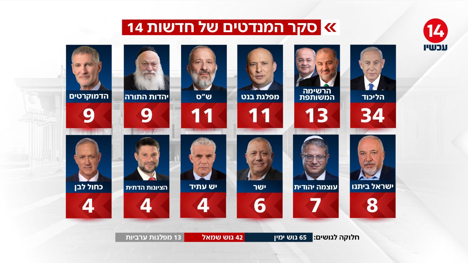 בחלוקת הגושים, גוש הימין מוביל עם 65 מנדטים (עליה של מנדט מהשבוע שעבר), גוש השמאל עומד על 42 מנדטים, והגוש הערבי כולל 13 מנדטים.