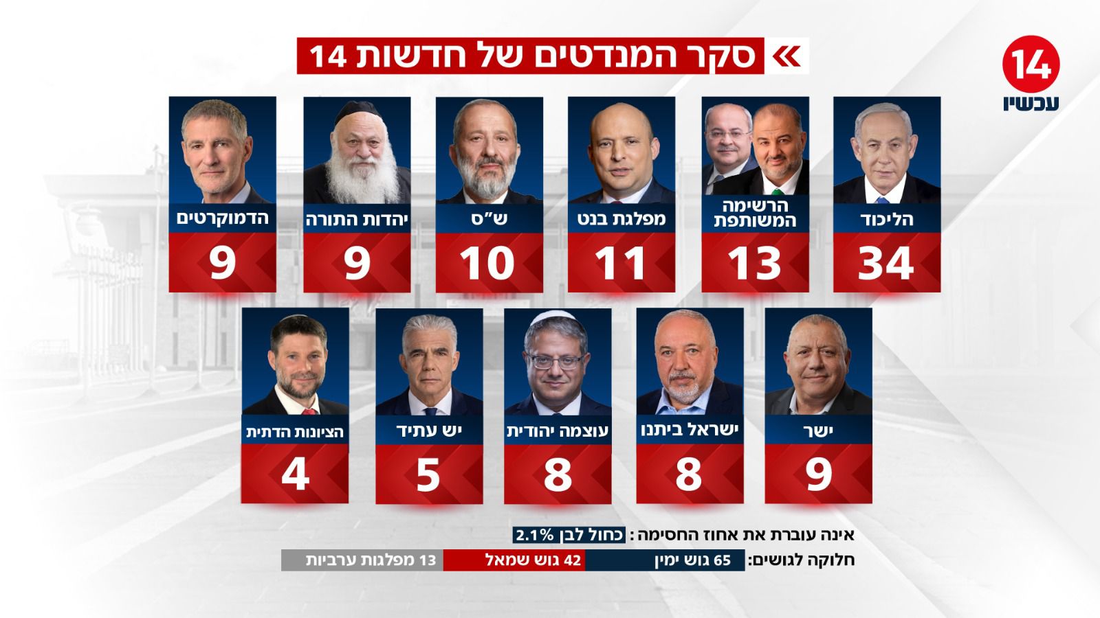 ברקע מתיחות ביטחונית וספק מתקפה באיראן, סקר חדשות 14 ששודר הערב במהדורה המרכזית מציג תמונת מנדטים עדכנית. הליכוד מוביל בפער ניכר, בנט רק שלישי. כך נראית המפה הפוליטית המלאה