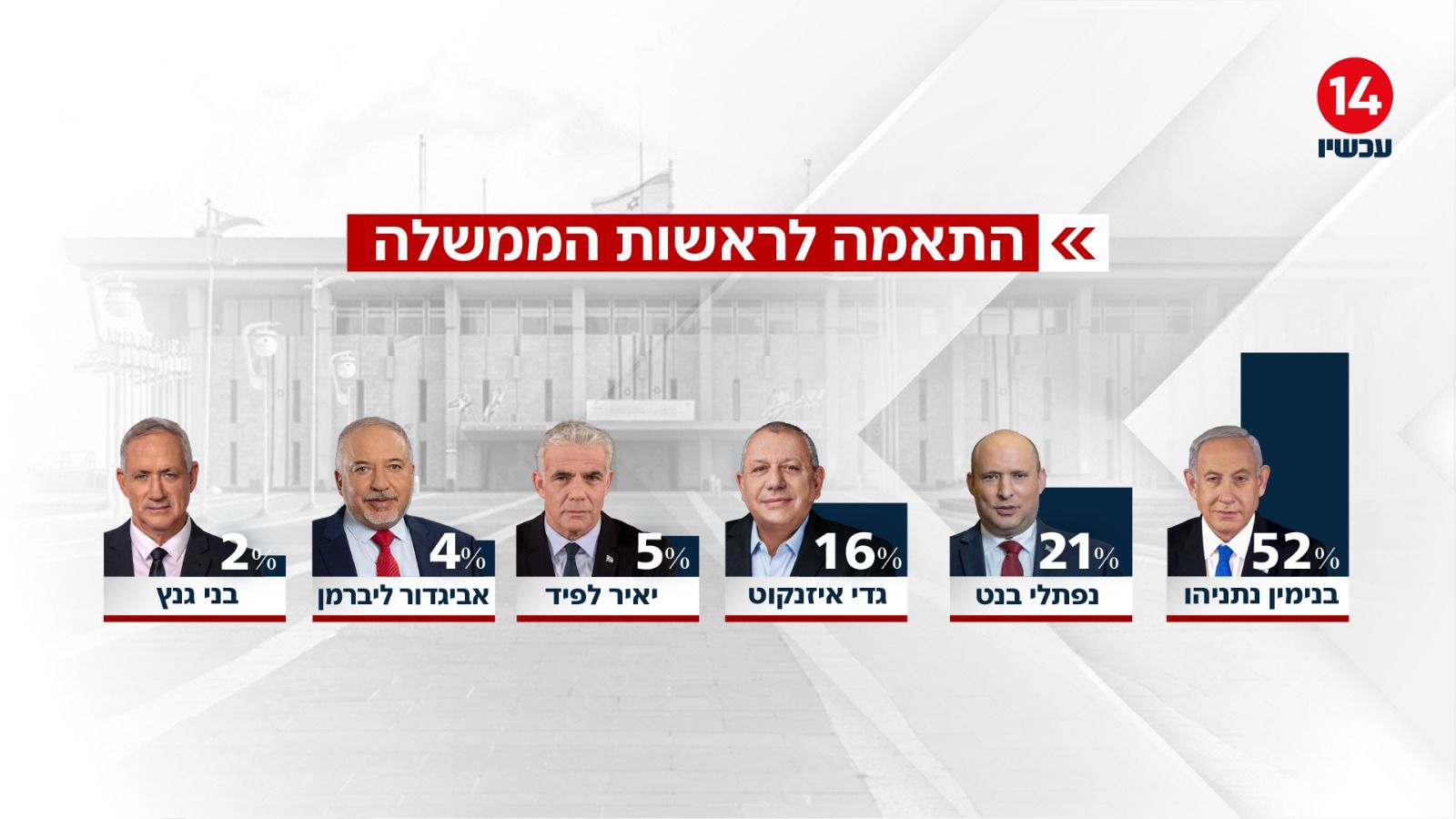 בבדיקת ההתאמה לראשות הממשלה מוביל בנימין נתניהו עם 52%. אחריו נפתלי בנט עם 21%. גדי איזנקוט מקבל 16%. יאיר לפיד עם 5%. אביגדור ליברמן עם 4%. בני גנץ עם 2%.