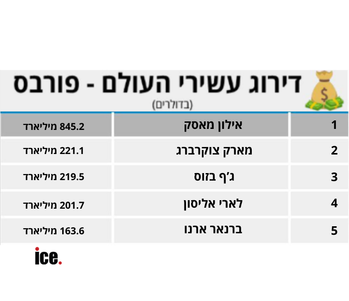 דירוג עשירי העולם השבועי של אתר ice מובא לפניכם כמדי שבוע, בהתבסס על נתונים בזמן אמת מ-"פורבס", ומציג שינויים משמעותיים בפסגה.