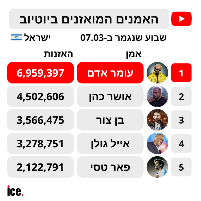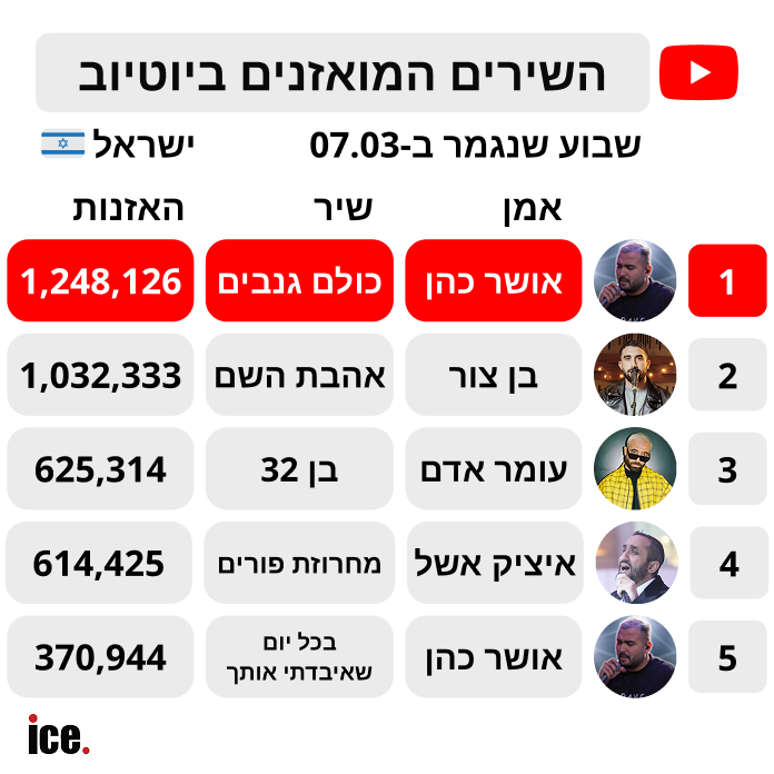 גם בזמן מבצע "שאגת הארי", הישראלים מחשים את הבריחה שלהם במוזיקה הישראלית. עומר אדם ואושר כהן מככבים ברשימה, אייל גולן בירידה ומי הזמר המפתיעה שנכנס השבוע לצמרת הגבוהה? זה דירוג היוטיוב של ice
