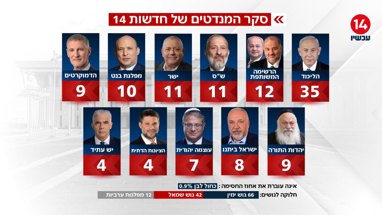 סקר חדש של חדשות 14 מציג התחזקות לגוש הימין על רקע הלחימה מול איראן וחיזבאללה. הליכוד מוביל בפער גדול, מפלגת בנט נחלשת, וכחול לבן כלל אינה עוברת את אחוז החסימה