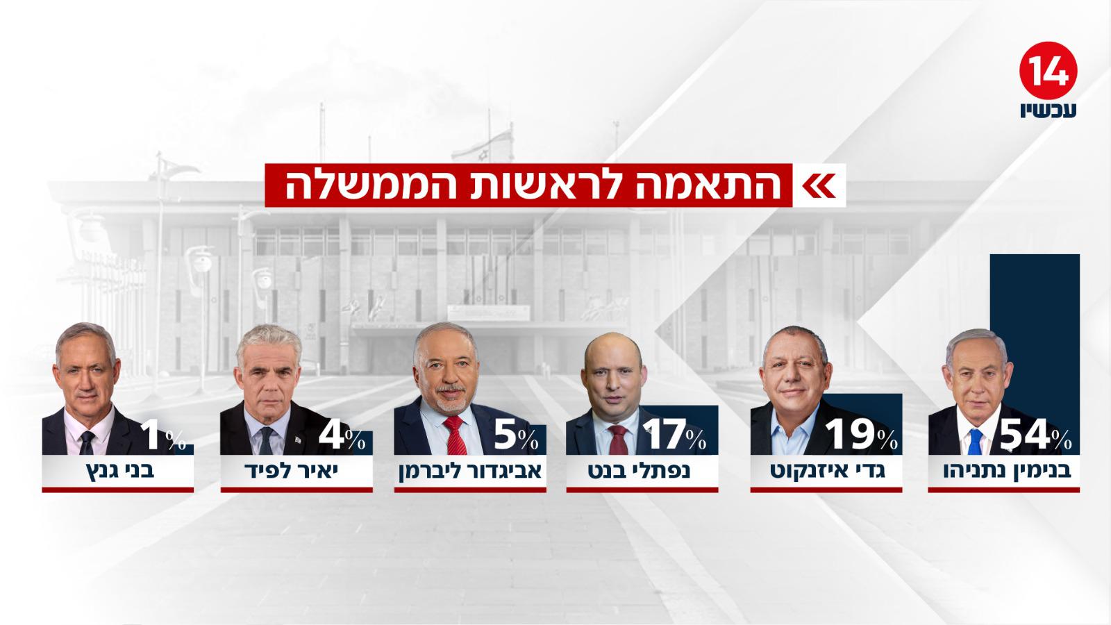 גם בשאלת ההתאמה לראשות הממשלה מוביל נתניהו בפער משמעותי. על פי הנתונים, 54 אחוז מהנשאלים סבורים כי הוא המתאים ביותר לתפקיד. אחריו גדי איזנקוט עם 19 אחוז, נפתלי בנט עם 17 אחוז, אביגדור ליברמן עם 5 אחוז, יאיר לפיד עם 4 אחוזים ובני גנץ עם אחוז אחד בלבד.