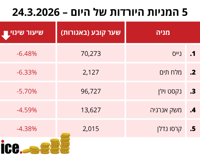 את טבלת המניות היורדות של היום מובילה מניית נייס שספגה את המכה הקשה ביותר היום עם התרסקות דרמטית של 6.48% לשער של 70,273 אגורות. מיד אחריה ממוקמת מלח תים, שאיבדה 6.33% מערכה וצללה לשער של 2,127 אגורות.