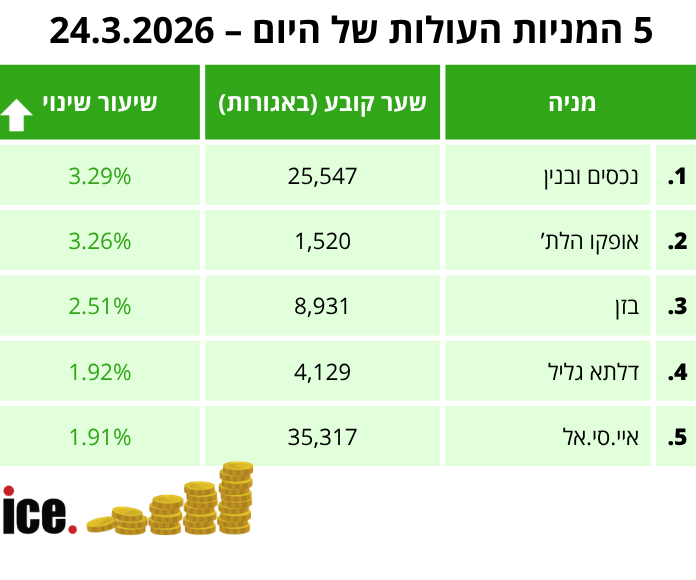 את טבלת המניות העולות של היום מובילה מניית נכסים ובנין, שרשמה עלייה נאה של 3.29% ונקבעה על שער של 25,547 אגורות. במקום השני ניצבת מניית אופקו הלת', שסיפקה למשקיעים נחת כשזינקה ב-3.26% לשער של 1,520 אגורות.