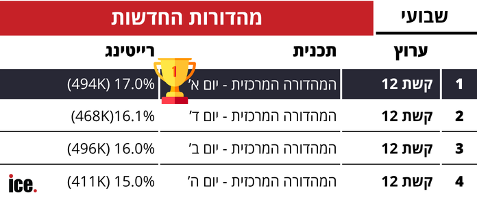 מהדורת החדשות של 12 תפסה את ארבעת המקומות הראשונים של מהדורות החדשות הכי נצפות של השבוע. גם בגזרת הפריים טיים ערוץ 12 מוביל מלבד האח הגדול שתפסה את יום שני