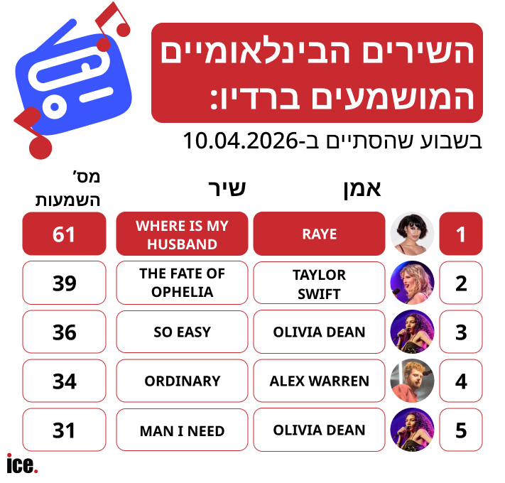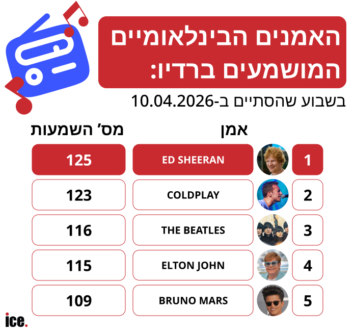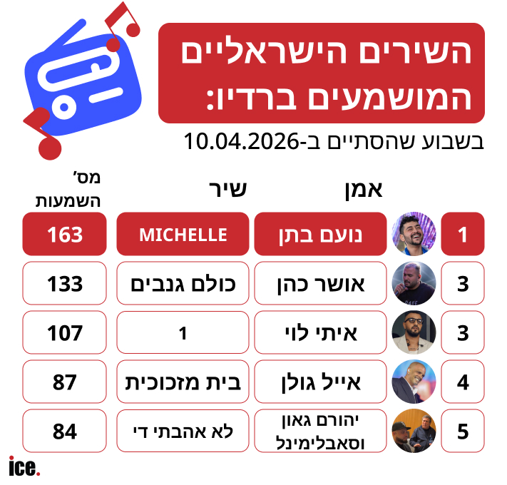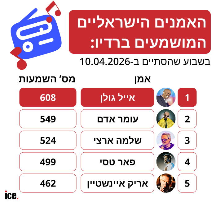 דירוג תחנות הרדיו השבועי של ice חושף את הרגלי ההאזנה של הישראלים בשבוע החולף. בגזרת האמנים הישראלים המושמעים ביותר, אייל גולן שומר על כס המלכות עם נתון מדהים של 608 השמעות בשבוע אחד.