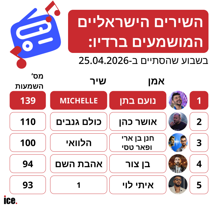 בגזרת השירים הישראליים המשומעים בתחנות הרדיו בשבוע החולף, "MICHELLE" של הנציג הישראלי לאירוויזיון, נועם בתן תופס את המקום הראשון בדירוג לאחר שהלהיט הושמע 139 פעמים. "כולם גנבים" של אושר כהן במקום השני לאחר שהושמע 110 פעמים.