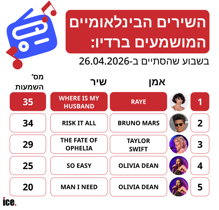 בגזרה האחרונה בדירוג, השירים הבינלאומיים המשומעים בתחנות הרדיו בשבוע האחרון. "WHERE IS MY HUSBAND" של RAYA עם 35 השמעות, מה שמעניק לה את המקום הראשון והיוקרתי בדירוג. ברונו מארנס עם הלהיט "RISK IT ALL" מייד אחריה עם השמעה אחת פחות, 34.