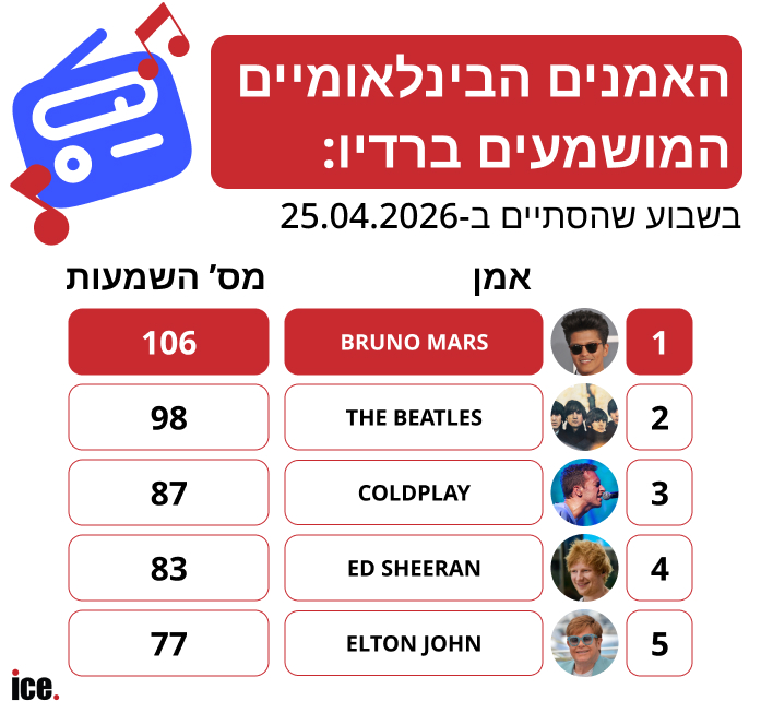 בגזרת האמנים הישראליים המשומעים בתחנות הרדיו בשבוע האחרון, אייל גולן חוגג ובענק. שיריו של הזמר שהצהיר בסוף השבוע האחרון כי מעוניין להיכנס לכדורגל הישראלי הושמעו 659 פעמים. מייד אחריו, הזמר המנוח, אריק איינשטיין הושמע 503 פעמים.