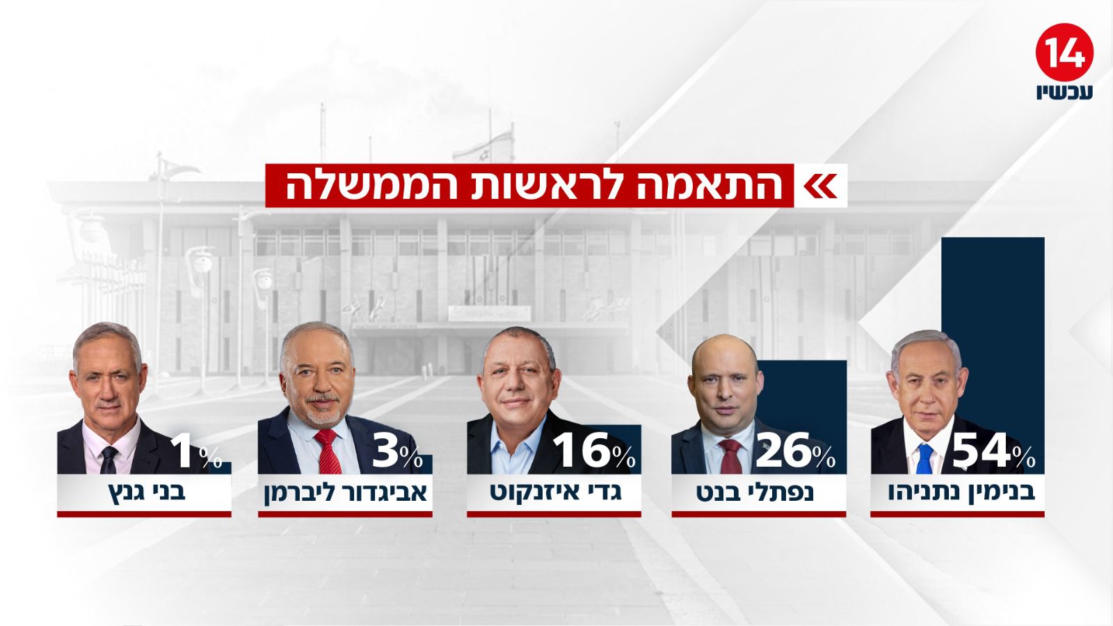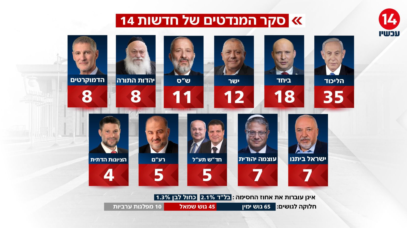 לאחר שיאיר לפיד ונפתלי בנט הודיעו על איחוד המפלגות וריצה משותפות בבחירות ונחשפה תגובתו של ראש הממשלה בנימין נתניהו למהלך הדרמטי של צמד הפוליטיקאים, הערב (חמישי) פורסם סקר המנדטים החדש של חדשות 14. הסקר נערך על ידי שלמה פילבר בקרב 648 נשאלים המהווים מדגם מייצג של כלל האוכלוסייה.