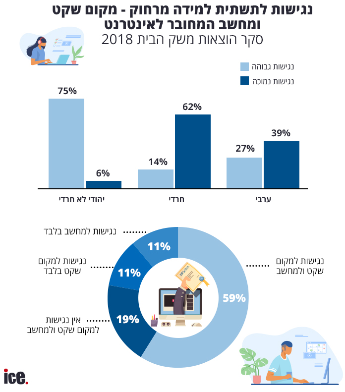 בבדיקה נמצא שבמצב בו כלל התלמידים הגרים באותו בית צריכים להשתמש בתשתית הלמידה מרחוק באותו הזמן, ב-59% ממשקי הבית קיימת נגישות טובה, בעוד ש-19% הנגישות נמוכה מאד. בקרב האחרונים נרשם שיעור גבוה של תלמידים חרדים וערבים, נתון שמוסבר בהכנסה הנמוכה המאפיינת שני מגזרים אלה.