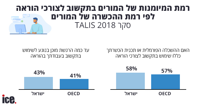 כך, בסקר TALIS מ-2018 השיבו 58% מהמורים הנשאלים שהשכלתם הפורמלית או הכשרתם בבית הספר בו הם מועסקים כללה שימוש בתקשוב לצרכי הוראה, כשדווקא כאן הנתון דומה – ואף גבוה - מממוצע ה-OECD שעומד על 57%. 43% מהנשאלים השיבו שהם מרגישים מוכנים במידה בינונית או רבה לעשות שימוש בתקשוב בהוראה, גם פה מעט גבוה מממוצע ה-OECD שהוא 41%.