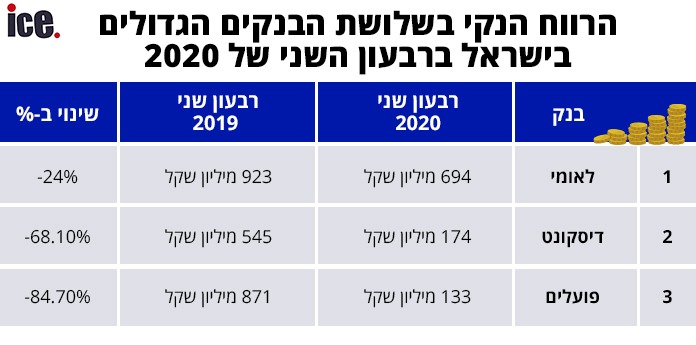 במקום השני, בנק דיסקונט בניהולו של אורי לוין, שסיכם את הרבעון השני עם ירידה של 68% ברווח הנקי, מ-545 מיליון שקל ברבעון השני של 2019, ל-174 מיליון שקל ברבעון השני של 2020. במקום השלישי, בנק הפועלים בניהולו של דב קוטלר, שרשם צניחה של כ-85% ברווח הנקי – מ-871 מיליון שקל ברבעון השני של 2019, ל-133 מיליון שקל ברבעון השני של 2020.