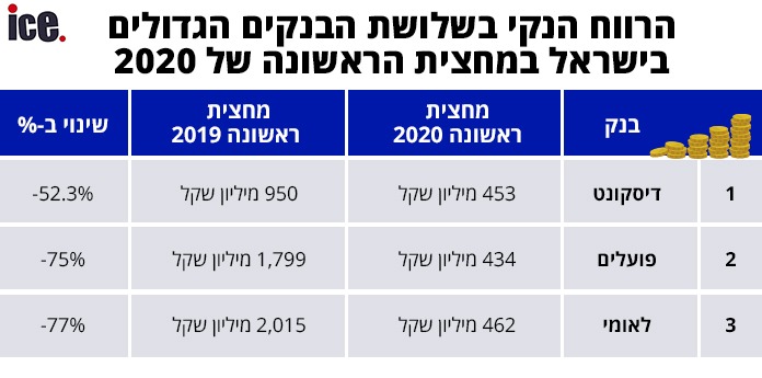 מבחינת נתוני המחצית הראשונה של 2020, עולה כי תמונת המצב מתהפכת. לאומי אמנם נותר הבנק עם הרווח הנקי הגדול ביותר – 462 מיליון שקל במחצית הראשונה של 2020, אולם גם זה עם הירידה הגדולה ביותר – 77% בהשוואה למחצית 2019, אז רשם הבנק רווח נקי של כ-2 מיליארד שקל. במחצית הראשונה של 2020 רשם לאומי הוצאה להפסדי אשראי בהיקף של 1.7 מיליארד שקל, כאשר כ-84% מהסכום האמור הינו גידול בהפרשה הקבוצתית. שיעור ההוצאה להפסדי אשראי בלאומי עמד על 1.19%, בהשוואה לשיעור של 0.19% בתקופה המקבילה אשתקד.