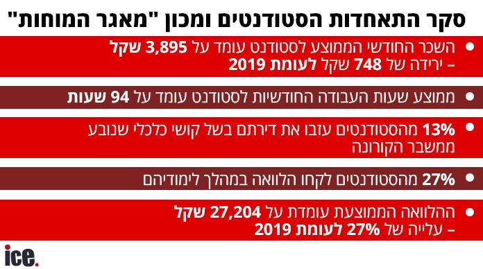 עוד עולה כי השכר החודשי הממוצע של הסטודנטים העובדים עומד על 3,895 שקל, והוא ירד ב-748 שקל בהשוואה לשנת 2019. בנוסף, ממוצע שעות העבודה בחודש לסטודנט הוא 94 שעות, ירידה קלה בהשוואה לשנה שעברה.