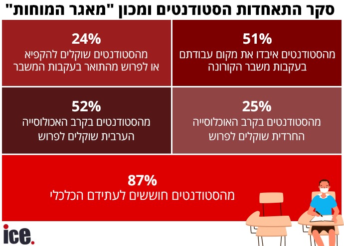 סקר שנערך בקרב כ-10,000 סטודנטים חושף כי 24% שוקלים להפסיק את הלימודים בסמסטר הקרוב בעקבות המשבר הכלכלי. 13% מהסטודנטים נאלצו לעזוב את דירתם, ברקע ירידה משמעותית בשכר החודשי הממוצע שלהם