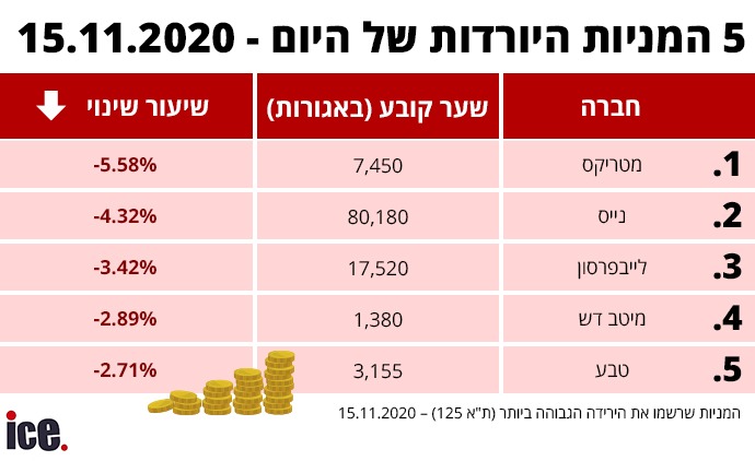 במניות היורדות מטריקס מובילה עם איבוד של 5.85% מערכה בדרך לשער של 7,450 אג'. במקום השני נייס שירדה ב-4.32% ל-80,180 אג'. לייבפרסון במקום השלישי עם 3.42% ושער של 17,520. מיטב דש במקום הרביעי לאחר שאיבדה 2.89% מערכה בדרך ל-1,380 אג'. סוגרת את החמישייה טבע שירדה ב-2.71% ל-3,155 אג'.
