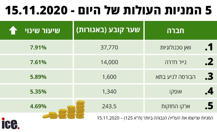 את רשימת חמש המניות העולות, מוליכה וואן טכנולוגיות לאחר ההודעה על הרבעון השלישי המוצלח, עם עלייה של 7.91% ושער של 37,700. נייר חדרה במקום השני עם 7.61% בדרך לשער של 14,000 אג'. הבורסה לניירות ערך בת"א שלישית עם 5.89% לשער של 1,600 אג', אופקו במקום הרביעי עם 5.35% ל-1,340 אג' וובמקום החמישי ארקו החזקות עם עלייה של 4.69% ל-243.5 אג'.