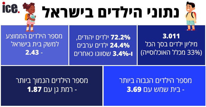 על פי נתוני הלשכה המרכזית לסטטיסטיקה שפורסמו היום (רביעי), בסוף 2019 חיו בישראל 3.011 מיליון ילדים (בני 17-0), שהם כ-33% מאוכלוסיית המדינה. מתוכם כ-2.173 מיליון ילדים יהודים (72.2%), 735 אלף ילדים ערבים (24.4%) ועוד 103 אלף ילדים (3.4%) שסווגו כאחרים (בלתי מסווגים לפי דת במרשם האוכלוסין ונוצרים לא ערבים).
