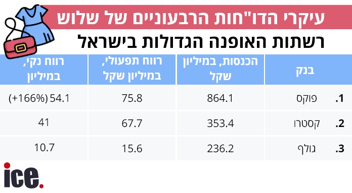 הרווח של פוקס ברבעון השלישי זינק ב-166% ל-54 מיליון שקל, קסטרו עברה מהפסד של 31 מיליון שקל ברבעון המקביל אשתקד לרווח של 41 מיליון שקל, וגולף גם היא טיפסה לרווח מהפסד