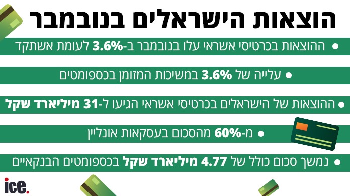 מהנתונים עולה כי ההוצאות של הישראלים בכרטיסי אשראי בנובמבר 2020, המהווה חודש עם מבצעים מיוחדים דוגמת בלאק פריידי, סייבר מאנדיי ושופינג IL, הגיעו לסכום כולל של 31 מיליארד שקל. בהשוואה לתקופה המקבילה, בשנת 2019, מדובר על עלייה של כ-3.6% בסך הכל בהוצאות בכרטיסי אשראי שהגיעו בנובמבר אשתקד לסכום כולל של 29.9 מיליארד שקל.