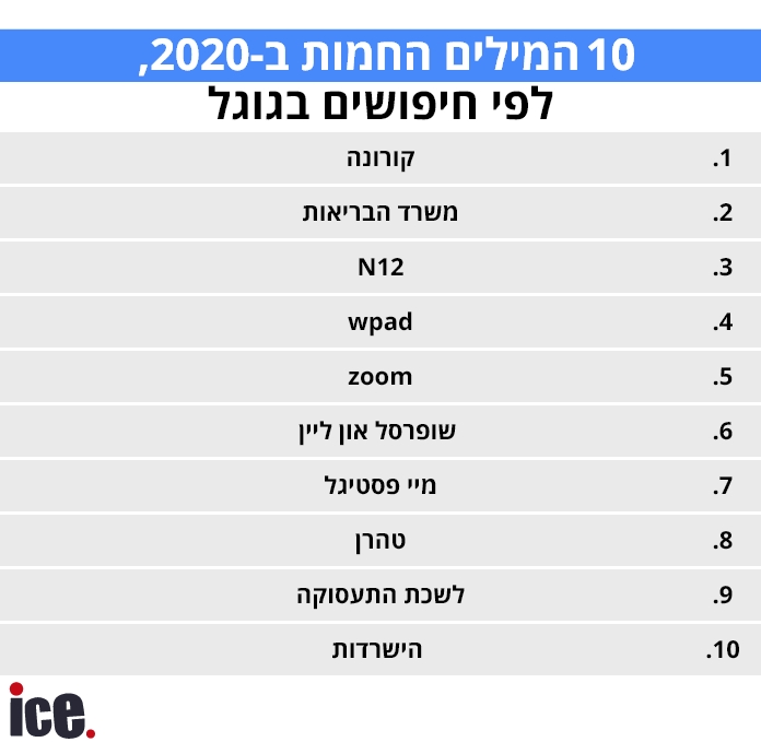 2020 הייתה ללא ספק שנת הקורונה, שריכזה את מרבית העניין ברשימת "עשרת החיפושים החמים של השנה" ודחקה החוצה את מערכות הבחירות בישראל ובארה״ב: המושג קורונה מדורג במקום הראשון ברשימה ומשרד הבריאות במקום השני השלכות המגפה באות לידי ביטוי בחיפושים נוספים, ביניהם: WPAD, פרוטוקול אבטחה לעבודה מרחוק, במקום הרביעי, אפליקציית זום, שירות שיחות בווידאו שרובנו פגשו אותה לראשונה, במקום החמישי, שופרסל און ליין, שירות המשלוחים של שופרסל, במקום השישי ולשכת התעסוקה שישראלים רבים נעזרו בשירותם במקום התשיעי.