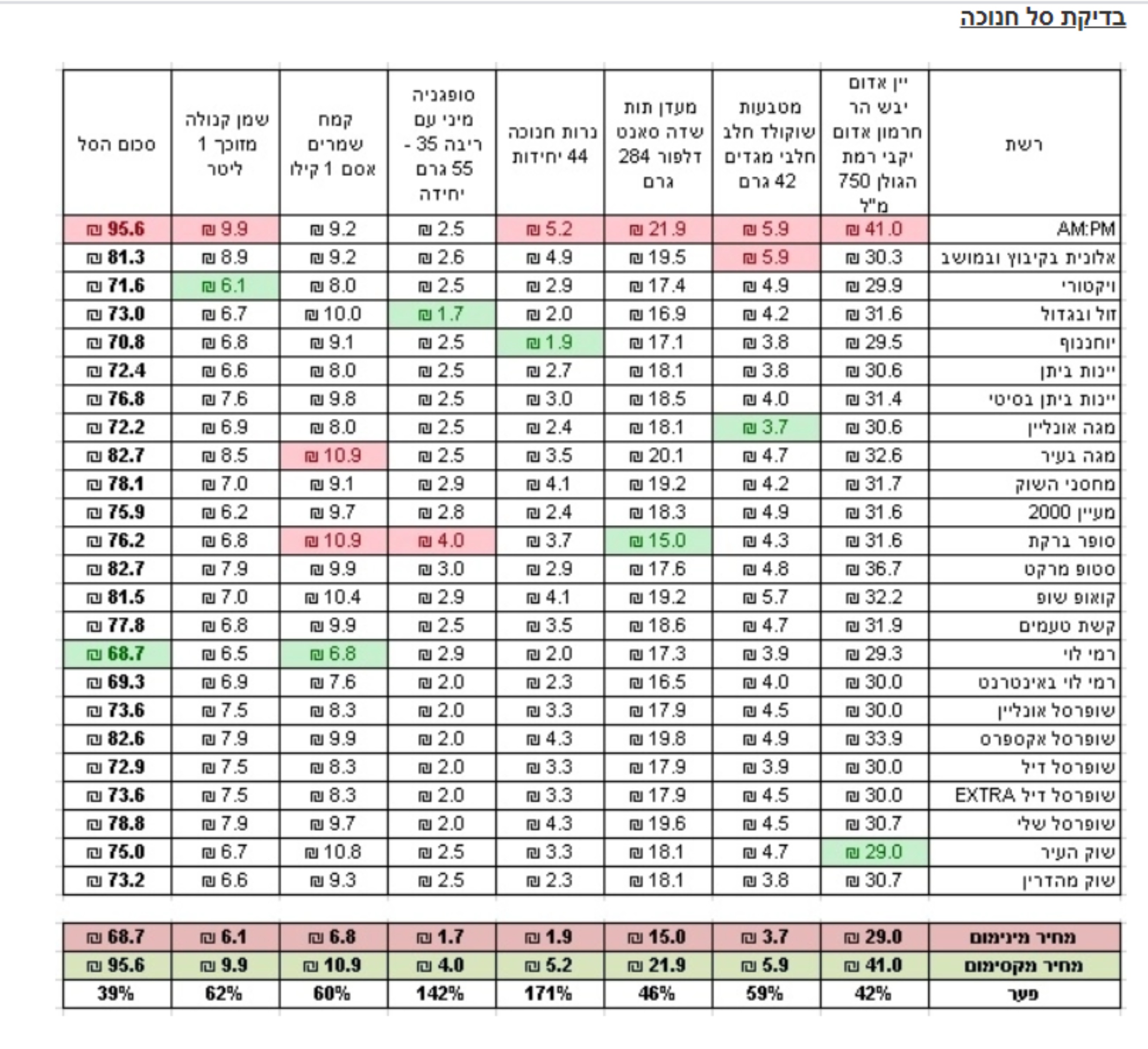 הבדיקה נערכה באמצעות אתר פרייסז ב-24 רשתות שיווק ואתרי און ליין. המחיר המוצג הוא המחיר הממוצע של כלל הסניפים של אותה רשת. רשתות שנמצאו בהן פחות מ 85% מכלל מוצרי הסל הוצאו מהבדיקה. כאשר מוצר אינו נמצא בכל הרשת, נלקח לגביו המחיר הממוצע של שאר הרשתות שנבדקו.