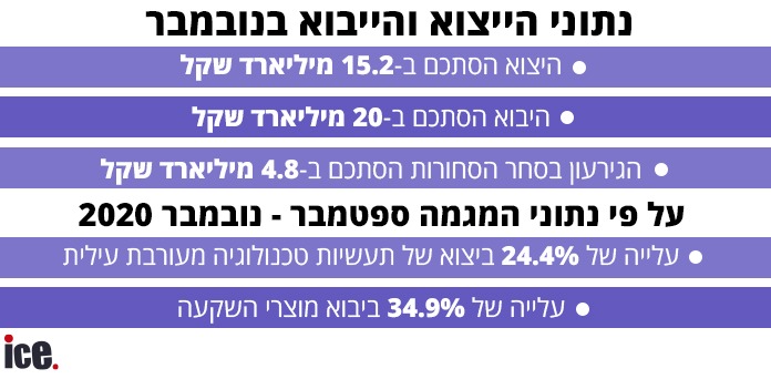 ייצוא הסחורות הסתכם בחודש נובמבר 2020 ב-15.2 מיליארד שקל. 85% מסכום זה היה יצוא תעשייתי, כרייה וחציבה (למעט יהלומים), 14% יצוא יהלומים ו-1% יצוא חקלאי, ייעור ודיג. היצוא התעשייתי, כרייה וחציבה עלה בספטמבר-נובמבר 2020 ב-11.1% בחישוב שנתי. זאת, בהמשך לעלייה של 17% בחישוב שנתי, בחודשים ביוני - אוגוסט 2020.