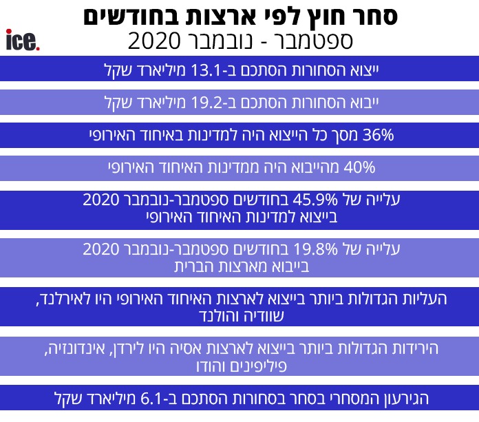 בחודשים ספטמבר-נובמבר 2020 עלה ייצוא הסחורות (למעט אוניות, מטוסים ויהלומים), ב-8.8% בחישוב שנתי. זאת, בהמשך לעלייה של 14.4% בחישוב שנתי ביוני-אוגוסט 2020. ייצוא הסחורות לארצות האיחוד האירופי עלה ב-45.9% בחישוב שנתי בחודשים ספטמבר–נובמבר 2020 (עלייה של 3.2% בממוצע לחודש), בהמשך לעלייה של 2.7% בחודשים יוני-אוגוסט 2020. מתחילת השנה, העליות הגדולות ביותר בייצוא (ללא יהלומים) לארצות האיחוד האירופי, היו בייצוא לאירלנד, שוודיה והולנד.
