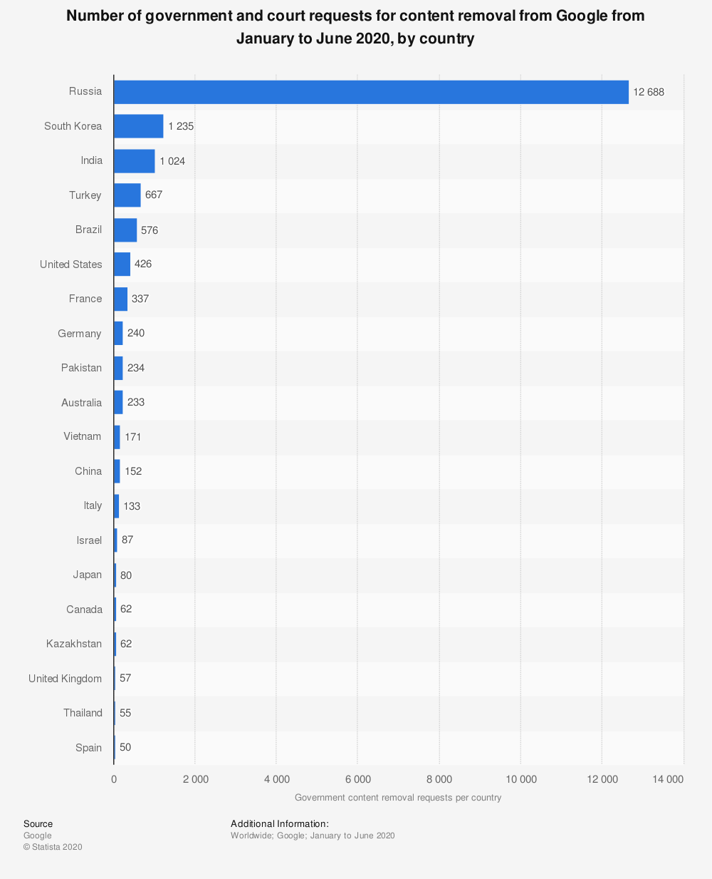 דווקא רוסיה הייתה ללא ספק המבקשת הפורייה ביותר להסרת תוכן במחצית הראשונה של שנת 2020. במהלך התקופה האחרונה שדווחו, בתי משפט וגורמים בכירים אחרים של ממשלת רוסיה הגישו לגוגל 12,688 בקשות להסרת נתונים.