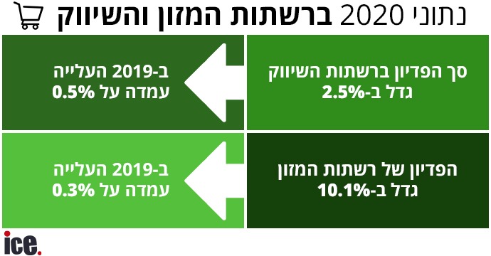 על פי הנתוני הלשכה המרכזית לסטטיסטיקה, רשתות השיווק שעלו ב-0.5% בלבד ב-2019, הגדילו את הפידיון פי חמש, ברשתות המזון עלו מ-0.3% ללא פחות מ-10.1%. ותודה לקורונה