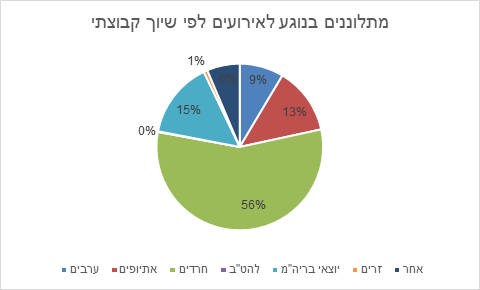 פילוח התלונות בנוגע לאירועים לפי שיוך קבוצתי: 56% מהמתלוננים ליחידה במהלך השנה פנו בקשר לאירועים ביחס לחברה החרדית, עיקרן אמירות פוגעניות של אישי ציבור או אמירות בתקשורת נגד החברה החרדית, 15% בקשר ליוצאי ברית המועצות לשעבר, 13% בקשר ליוצאי אתיופיה, 9% בקשר לחברה הערבית, 1% נגד מבקשי מקלט ו-6% בקשר לשאר הקבוצות באוכלוסייה.
