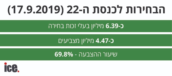 על פי הלמ"ס, בבחירות לכנסת ה-22 (17.9.2019) בישראל היו כ-6.39 מיליון בעלי זכות בחירה ולקלפיות הגיעו כ-4.47 מיליון מצביעים בלבד, המשמעות היא ששיעור ההצבעה עמד על 69.8% בסך הכל. בבחירות האחרונות, לכנסת ה-23 (2.3.2020), בישראל היו כ-6.45 מיליון בעלי זכות בחירה, לקלפי הטריחו את עצמם כ-4.62 מיליון מצביעים בסך הכל, אך שיעור ההצבעה עלה ל-71.5%.