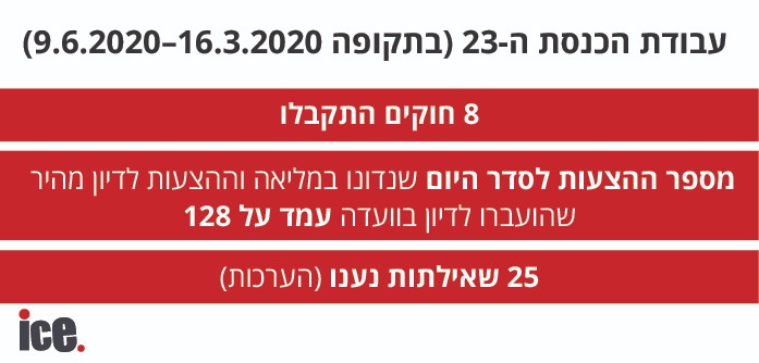 בבחינת עבודת הכנסת ה-23 (בתקופה 16.3.2020–9.6.2020), היו בסך הכל 8 חוקים שהתקבלו, בעוד מספר ההצעות לסדר היום שנדונו במליאה וההצעות לדיון מהיר שהועברו לדיון בוועדה עמד על 128, רק 25 שאילתות נענו (הערכות).