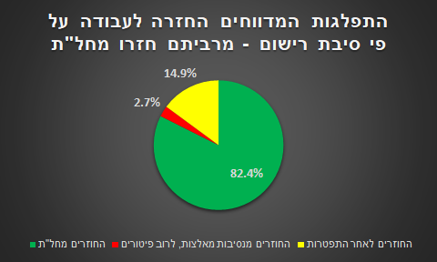 לדברי ד"ר זהר, על פניו סיכויי החזרה לעבודה של היוצאים לחל"ת גבוהים יותר, היות ויש להם מעסיק לחזור אליו. בעוד, שלדורשי העבודה שנותרו ללא מעסיק יהיה קשה יותר לחזור למעגל העבודה, כאשר לאלו שבחרו להתפטר יהיה קשה אף יותר. אם כי, הוא מדגיש, נוכח המשבר התעסוקתי רבים מהמעסיקים עשויים שלא להחזיר עובדיהם מחל"ת וגם מי שיש לו לכאורה מעסיק עלול להתקשות לשוב למעגל העבודה. "עם זאת", מבהיר ד"ר זהר, "ברור שסיכויי החזרה שלהם למעגל העבודה גבוהים יותר, ואכן פילוח נתוני המדווחים על חזרה לעבודה מוכיחים זאת בבירור". על פי הנתונים, עולה כי 82.4% (165,677) מכלל המדווחים על חזרה לעבודה הם כאלה שחזרו מחל"ת, 14.9% (29,910) הם כאלה שחזרו למעגל העבודה לאחר שנפלטו ממנו בגין פיטורים או נסיבות מאלצות אחרות ורק 2.8% בלבד (5,627) הם כאלה שחזרו למעגל העבודה לאחר שעזבו אותו מבחירה, קרי התפטרו.