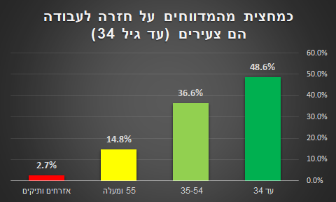 הפילוח הגילאי של המדווחים על חזרה לעבודה מעלה כי 97,793, המהווים 48.6% מהמדווחים, הם צעירים (מתחת ל 34), לעומת כ- 36.6% שמהווים בני 35-54, קבוצת הגיל העיקרית בשוק העבודה. הסבר לנתונים ניתן למצוא בפתיחת תחומי המכירות והשירותים, ובכללם הקניונים, חנויות הרחוב, הברים, המסעדות ובתי המלון. יש לשים לב, כי 43.1% מהמדווחים על חזרה לעבודה הם עובדים במקצועות ההוראה, החינוך וההדרכה (21%), המכירות (16.8%) והשירותים (5.3%), גבוה יותר משיעורם בקרב הנרשמים במהלך הסגר השלישי שעמד על 40.3%.