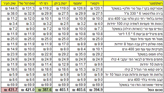 על פי הנתונים שנבדקו, הרשת הזולה ביותר מבין אלו שנבדקו הייתה רמי לוי עם עלות סל של 387 שקל בממוצע של כל הסניפים. מעט מאחור נמצאת רשת ויקטורי עם סל בעלות 394 שקל בממוצע. הרשת היקרה ביותר היא רשת שוק העיר שם הסל עלה 431 שקל בממוצע. גם בשופרסל שלי הסל יעלה לכם לא מעט: 421 שקל בממוצע לסניפי הרשת.
