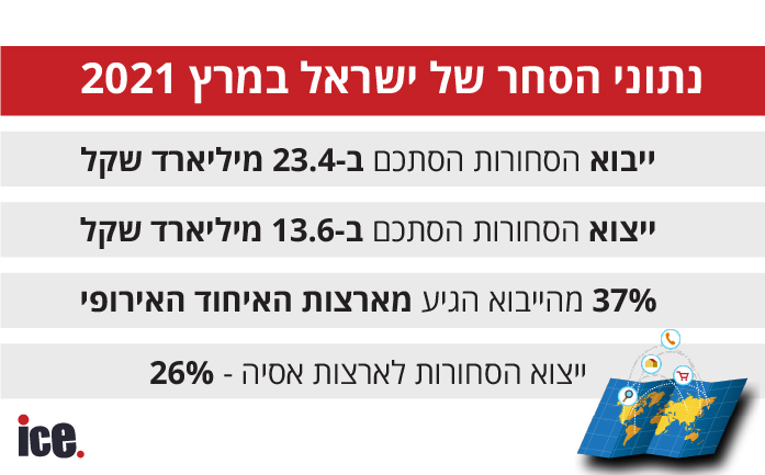 הלשכה המרכזית לסטטיסטיקה פרסמה היום (ראשון) את נתוני סחר החוץ בחודש מרץ 2021. יצוא הסחורות (למעט יהלומים) הסתכם ב-13.6 מיליארד שקל. מסך יצוא הסחורות, הייצוא לארצות האיחוד האירופי היה 24%, הייצוא לארצות הברית - 25%, הייצוא לארצות אסיה - 26%, ו-25% הנותרים - ליתר ארצות העולם.