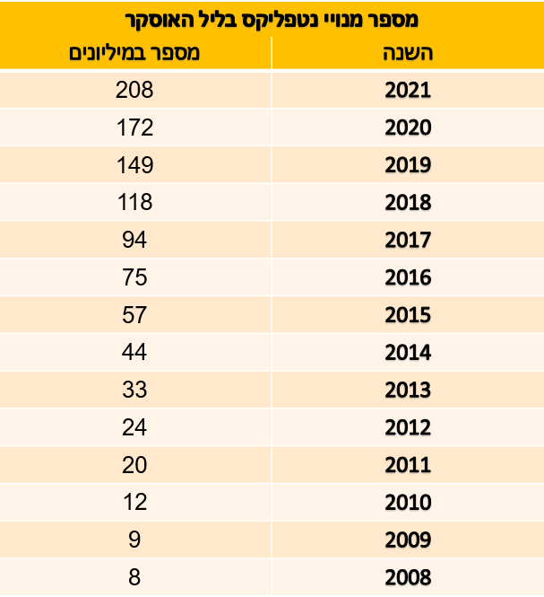 אז הנה פריט מידע מעניין: בליל האוסקר נטפליקס החזיקה ב-208 מיליון מינויים לשירותים. לפני עשור בתאריך זה היו לענקית הסטרימינג רק 20 מיליון מנויים. בשנתיים האחרונות עלה מספר המנויים של נטפליקס בכ-30% ובארבע השנים האחרונות ביותר מ-50%.