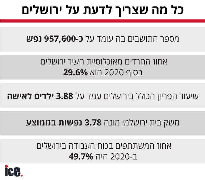 על פי נתוני הלמ"ס לכבוד יום ירושלים: שיעור הפריון הכולל בעיר הבירה עמד על 3.88 ילדים לאישה, אחוז המשתתפים בכוח העבודה בירושלים ב-2020 היה 49.7%, לעומת 61.8% בממוצע הארצי. וגם: כמה רישומים פליליים נרשמו לתושבים העיר? התשובות בפנים