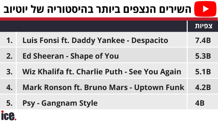 דירוג יוטיוב: מהם השירים הכי נצפים בכל הזמנים?