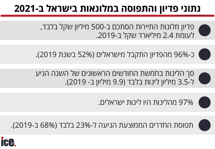 על פי הנתונים, בינואר-מאי 2021, סך כל הלינות בחמשת החודשים הראשונים של השנה הגיע ל-3.5 מיליון לינות בלבד (9.9 מיליון ב- 2019). 97% מהלינות היו לינות ישראלים. תפוסת החדרים הממוצעת הגיעה ל-23% בלבד (68% ב-2019).