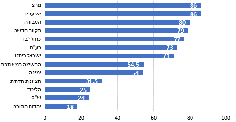 הישרדות הממשלה החדשה- 46% מהציבור הישראלי צופים שהממשלה החדשה תחזיק מעמד לפחות שנה, לעומת 45% שחושבים כי הסיכויים לכך נמוכים. רוב בקרב מצביעי מפלגות הקואליציה סבורים כי תוחלת החיים של הממשלה החדשה היא מעבר לשנה, למעט ימינה ורע"ם.