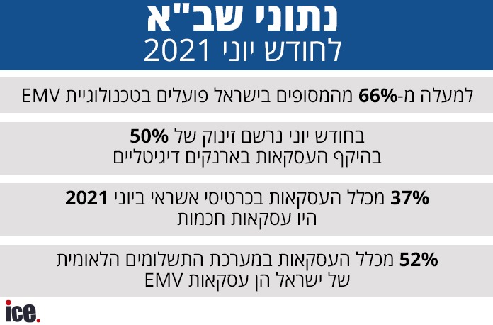 במהלך החודש שעבר, 52% מכלל העסקאות במערכת התשלומים הלאומית בוצעו במערכת ה-EMV. עוד עולה מנתוני שב"א כי 37% מכלל העסקאות בכרטיסי אשראי ביוני 2021 היו עסקאות חכמות (עסקאות קונטקטלס או באמצעות ארנקים דיגיטליים).