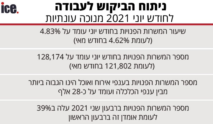 ניתוח הביקוש לעבודה לחודש יוני 2021 מנוכה עונתיות: שיעור המשרות הפנויות בחודש יוני עומד על 4.83% (לעומת 4.62% בחודש מאי), מספר המשרות הפנויות בחודש יוני עומד על 128,174 (לעומת 121,802 בחודש מאי), מספר המשרות הפנויות בענפי אירוח ואוכל הינו הגבוה ביותר מבין ענפי הכלכלה ועומד על כ-28 אלף.