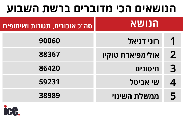 שבוע דרמטי במיוחד היה בישראל ומלא באירועים ופרשיות שהיו די שונות מהשבועות שקדמו להם. הפרשן הצבאי רוני דניאל הלך לעולמו במפתיע, אבישג סמברג הדהימה את כולם עם מדליית הארד בטאקוואנדו, הייתה עלייה בתחלואה בקורונה ופרשת שי אביטל עוררה סערה. אתר ice מציג לכם את הנושאים החמים של השבוע, הנתונים נאספו ונותחו ע"י חברת סקופר המתמחה בניטור מדיה ומחקרי שיח ברשת.