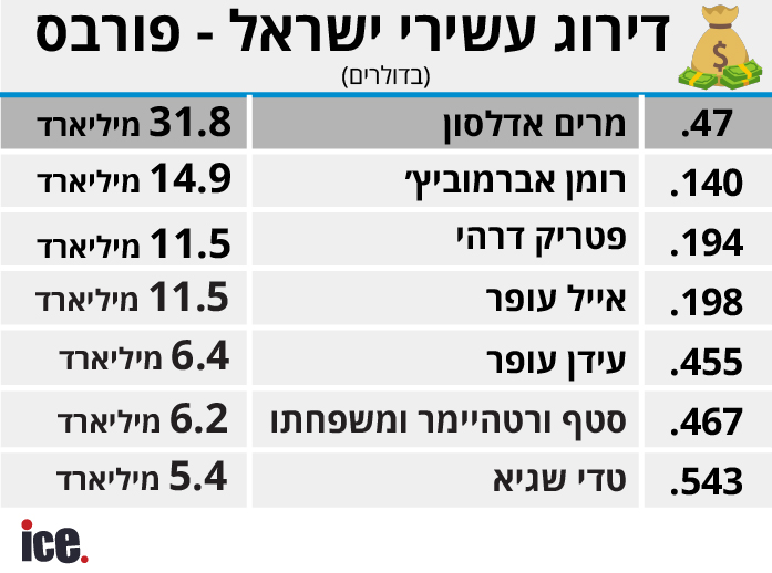 שבוע יחסית טוב לעשירים בישראל כשרוב הישראלים עלו בדירוג העולמי. על פי נתוני פורבס: מרים אדלסון, אלמנתו של שלדון אדלסון היא האזרחית הישראלית העשירה בעולם עם הון מוערך ב-31.8 מיליארד דולר, אדלסון נשארה באותו המקום בדירוג העולמי וניצבת מקום ה-47. במקום השני, הבעלים של צ'לסי, רומן אברמוביץ' האוליגרך שעלה מהמקום ה-144 למקום ה-140 לאחר שהונו גדל ב-300 מיליון דולר ומוערך ב-14.9 מיליארד דולר.