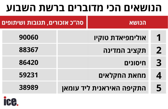 הנושאים החמים ביותר ברשת: אולימפיאדת טוקיו 2020 כאמור עם שבוע מוצלח לישראלים: נבחרת הג'ודו זוכה במדליית ארד, המתעמל ארטיום זוכה במדליית זהב, המנון התקווה נשמע בטוקיו. נושא נוסף הוא, תקציב המדינה שלראשונה מזה שלוש שנים, הממשלה מאשרת את תקציב המדינה שיעבור להצבעה בכנסת, הרפורמות הכלולות בתקציב המוצע יצרו שיח רב ברשת.